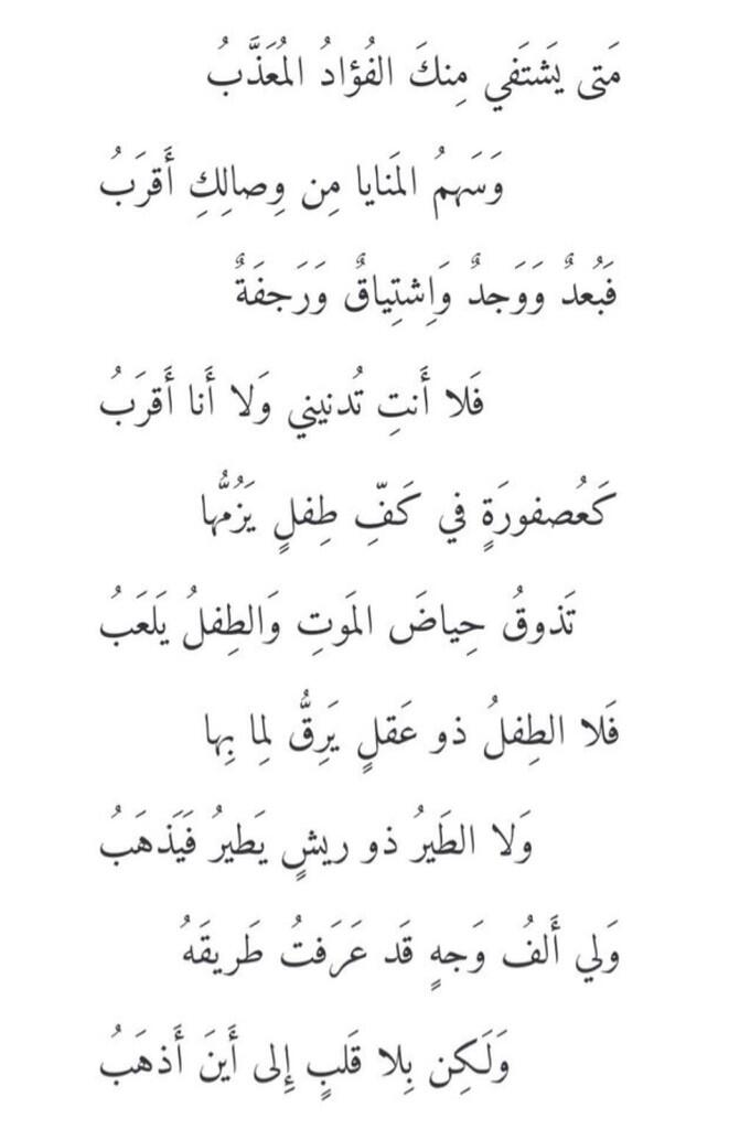 اشعار ÙÙØ³ ب٠اÙÙ ÙÙØ اصاب٠عش٠from good-morning.cc أَلا فَاِرحَمي صَبّاً كَئيباً مُعَذَّباً. فَقُلتُ وَلَم أَملِك لِعَمروِ بنِ مالِكٍ وَلي مِثلُ ما في شِعرِ مَن كانَ ذا هَوىً ٤.١ أيَا وَيْحَ مَنْ أمسَى يُخَلَّسُ عَقْلُهُ. ومن الشعراء العذريين المشهورين جميل بن معمر، والذي عُرف بجميل بثينة، لقد عشق بثينة، وهام بها، وتقدّم للزواج منها، لكنّه أيضًا لم يحصل عليها. أليس وعدتني يا قلب أني أذا ماتبت عن ليلى تتوبُ فأنا تائب عن حب ليلى فما لك كلما ذكرت ليلى #قيس بن الملوح #ليلى #قيس #اقتباس #شعر #شعر قديم #in arabic. وإن كنت تروي من شعر قيس بن ذُريح ( وهو الشاعر المتيم صاحب لبنى بنت الحباب. زعم النَّاس أَن الاستكثار من المحبوب والتداني مِنْهُ يكْسب الْمُحب ملالا والتنائي والبعد عَنهُ يحدث سلوا وَقد تداوينا بِكُل وَاحِد مِنْهُمَا فَلم ينجع ذَلِك الدَّوَاء إِلَّا أَنه على الْأَحْوَال كلهَا وجدت قرب الدَّار مِنْهُ خيرا من بعْدهَا عَنهُ. أيَا وَيْحَ مَنْ أمسَى يُخَلَّسُ عَقْلُهُ.